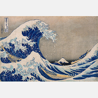 《冨嶽三十六景》全46図のひとつで、北斎の作品の中でもっとよく知られている傑作である。豪快に立ち上がる波間の奥に遠く富士山を望む景色で、房総から江戸に鮮魚を運ぶ船が、荷を下ろしたのち、神奈川沖にさしかかった時の情景と想定される。